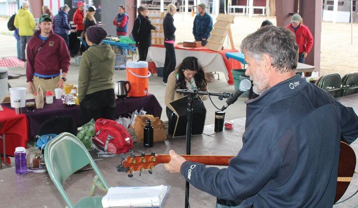 Tom Heywood plays guitar on the stage at the fairgrounds’ Payson’s Pavilion June 6 during the first Haines Farmers’ Market of the season. The markets are held 10 a.m. to 1 p.m. Saturdays and typically include hot drinks, crafts, and locally grown produce. Tom Morphet photo.