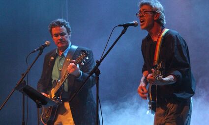 Fred Shields, left, and Greg Horner of Ed’s Plumbing, perform on the stage of the Chilkat Center during last weekend’s “Off Off Off Broadway,” an extravaganza to raise money for the Foundation for the Chilkat Center for the Arts. Smoke from a new smoke machine and a light show during the performance were created with improvements to the center funded by a recent grant of about $200,000 from the philanthropic Rasmuson Foundation. Tom Morphet photo.