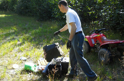 Chris Brooks hauls garbage from an alder thicket, including three discarded car batteries. For story, see this week’s edition of the Chilkat Valley News.