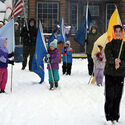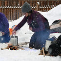 A small but lively crowd attended Southeast Alaska State Fair’s Winter Games on a snowy Saturday. Vanessa Wishstar and Sylvia Heinz compete in the tea-making competition. Jenn Walsh, Chris Downer, Piper Carlson and Tom Morphet were among dozens of residents who battled during an impromptu snowball fight after the closing ceremonies. Tom Morphet holds up Hunter Wishstar during the four by four race. Kyle Clayton photos.