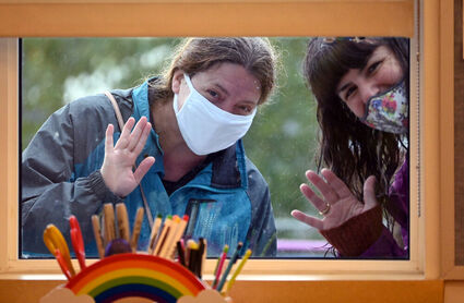 Parents Christie Swainhafer and Vanessa Wishstar wave to their children, Hazel and Hunter, on their first day of first grade.