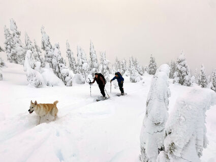 Meredith Pochardt, her dog Sophie and Brian Rougeux skin up the backside of Mount Ripinsky Sunday, Nov. 28 for a day of backcountry skiing. More than ten cars were lined up on Lutak Road over the weekend as backcountry enthusiasts took advantage of great snow conditions this week.