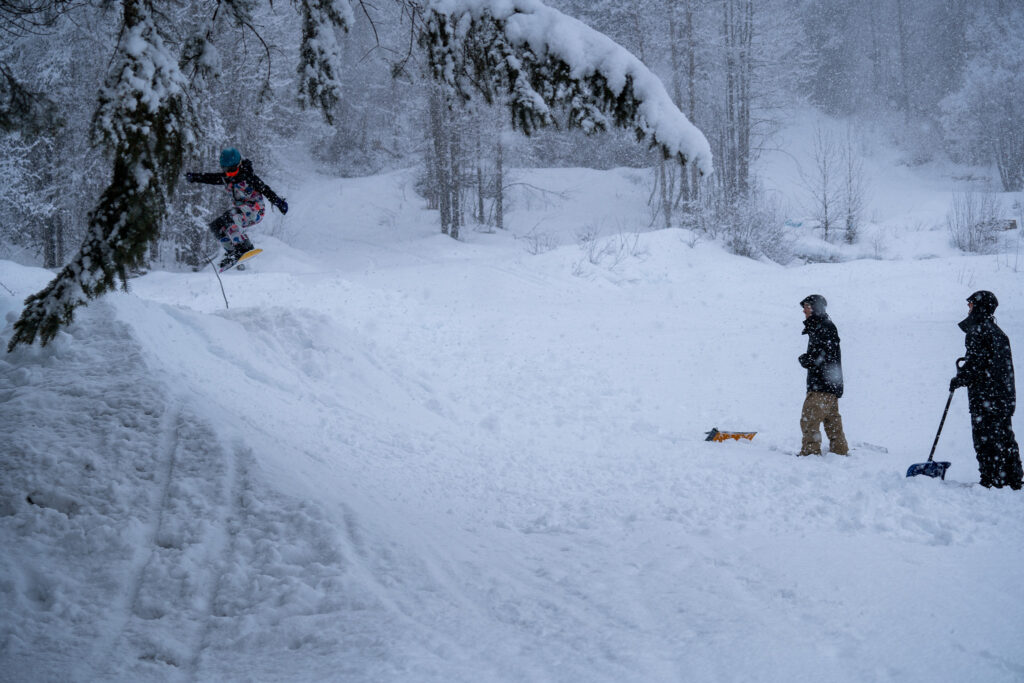 After more than an hour of work, the jump is ready. He’s sweating from the effort, but changes into his snowboard boots. Within a few minutes, he’s getting towed up on a snowmachine to hit the jump a few times.
