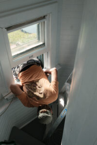 (Will Steinfeld/Chilkat Valley News) Haines resident and Eldred Rock Lighthouse Preservation Association director Dan Humphrey climbs into Eldred Rock Lighthouse, Sunday, Aug. 31, 2025.