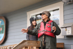(Rashah McChesney/Chilkat Valley News) (left) Jacques Turcotte talks to John Carlson about Carlson’s hewing axe on Friday, September 5, 2025, in Haines, Alaska.