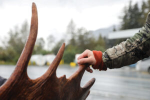 (Rashah McChesney/Chilkat Valley News) Baylee Pearson holds onto the rack of a moose she took on Monday, September 15, 2025, on the first day of hunting season in the Chilkat Valley. Pearson was the second person to report harvesting a moose at the Alaska Department of Fish and Game office in Haines. According to Fish and Game measurements, the moose had a 52.5 inch rack, and 5 points on both sides.