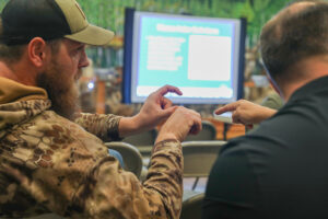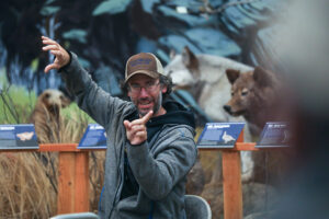 (Rashah McChesney/Chilkat Valley News) (left) Austin Finnan and Wildlife Trooper Josh Whitby describe an antler shape during a pre-season hunting meeting on Thursday, Sept. 11, 2025, at the American Bald Eagle Foundation in Haines, Alaska.