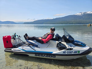 (Courtesty/Mandy Reigle) Mandy Reigle sits on the SeaDoo she uses to commute between Haines and Skagway.