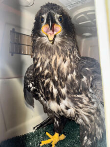 Moose, a juvenile eagle, in a kennel awaiting transport to Sitka for injuries she sustained in Haines.