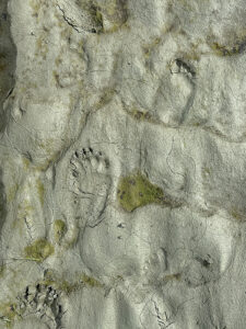 (Rashah McChesney/Chilkat Valley News) Tracks tell a story of a bear and a person walking barefoot in the mud on Chilkoot Lake on Sunday, Sept. 7, 2025, near Haines, Alaska.