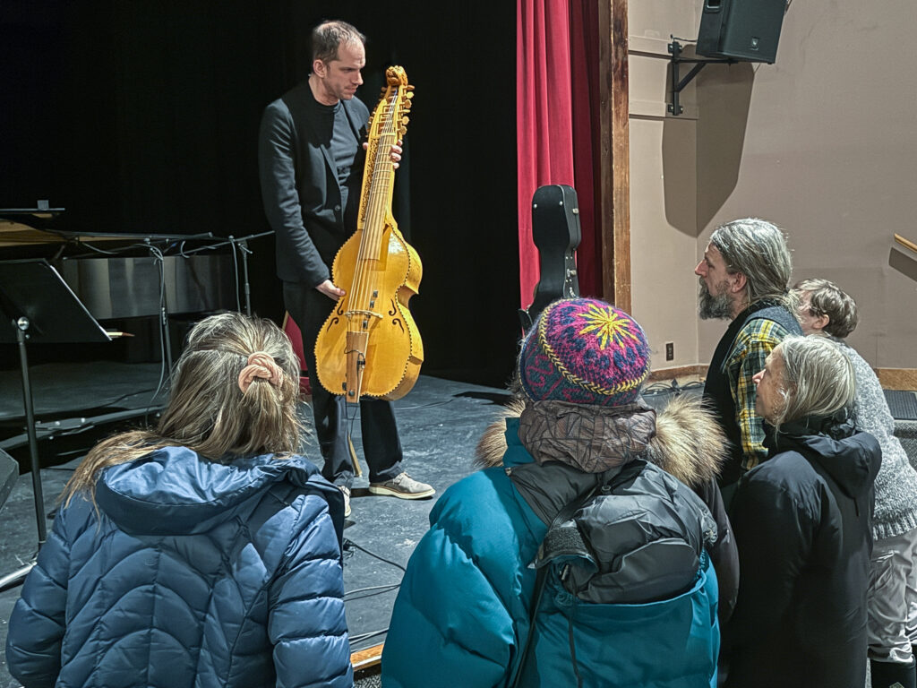 Sean Bryant leaned in close to examine Baker’s baryton which has a somewhat hidden set of pluckable strings running up the back of the neck. The instrument is exceptionally rare, so he’s not likely to find one to play for himself but joked that he was considering building one.
