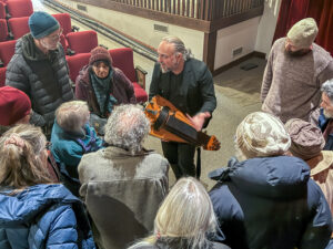 Efrén López answers questions about a Hurdy Gurdy that he played during a concert on Monday, March 9, 2026, at the Chilkat Center in Haines, Alaska. López was part of the trio Amour Courtois which plays jazz interpretations of medieval music. (Rashah McChesney/Chilkat Valley News)
