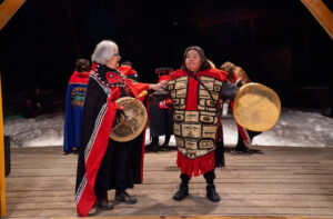 (Lizzy Hahn/ Chilkat Valley News) Jan Hill and Deanna Strong tell the audience the story behind the robe Strong is wearing on Friday, March 13, 2026 in Haines,Alaska.