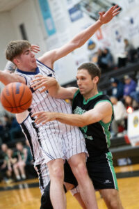 Kyle Fossman threads a pass around a Klawock defender. Sunday, March 22, 2026. (Will Steinfeld/Chilkat Valley News).