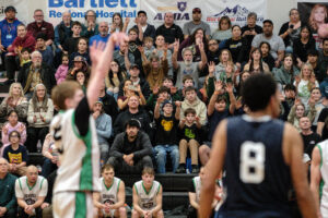 The crowd looks on as Jake Friske shoots game-sealing free throws. Saturday, March 28, 2026. (Will Steinfeld/Chilkat Valley News)