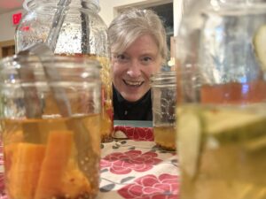 Leslee Downer poses with various pickled treasures from her garden during a Tuesday, Feb., 24, 2026, pop-up at Haines Brewing.