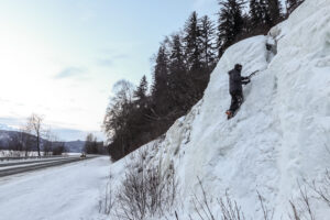Robert Reid climbs alongside the Haines Highway on on Friday, Feb. 20, 2026, near Haines, Alaska. (Rashah McChesney/Chilkat Valley News)