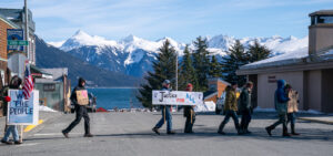 (Lizzy Hahn/ Chilkat Valley News) No Kings protesters cross Main Street in silence during the protest on Saturday, March 28, 2026 in Haines, Alaska.