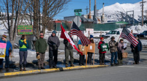 (Lizzy Hahn/ Chilkat Valley News) No Kings protesters stand in silence on Main Street on Saturday, March 28, 2026 in Haines, Alaska.