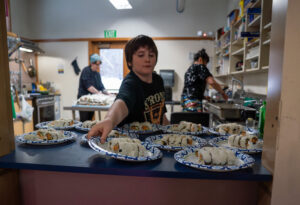 (Lizzy Hahn/ Chilkat Valley News) Klukwan student Felix Benassi prepares sushi for audience members after the Klukwan school circus performance on Thursday, March 19, 2026.