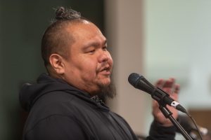 Daniel Klanott tells a story about how a clan house in Klukwan got its name on Saturday, Jan. 25, 2025, during the Northern Lights Showcase at the Chilkat Center in Haines, Alaska. (Rashah McChesney/Chilkat Valley News)
