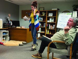 Haines Chamber of Commerce Director Amanda Brandon and Ken Gross chat in the Chamber of Commerce Office on Main Street on Jan. 21, 2025, in Haines, Alaska.