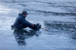 Michaael Wald laces on his skates with as he responds to help with the search for a man who fell through the ice on Thursday, Feb. 6, 2025, at Chilkoot Lake, near Haines, Alaska. (Rashah McChesney/Chilkat Valley News)