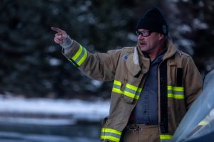 Haines Volunteer Fire Department Chief Brian Clay directs personnel from shore as they respond to a report of a man who fell through the ice while skating on Thursday, Feb. 6, 2025, at Chilkoot Lake, near Haines, Alaska. (Rashah McChesney/Chilkat Valley News)
