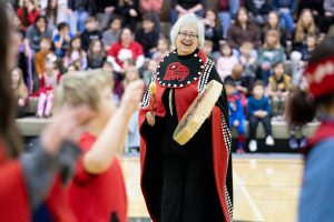 Jan Hill leads Haines Elementary School Students in Lingít dance at the Haines School Elizabeth Peratrovich Day celebration Thursday, February 13th, 2025.