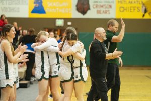 Haines players hug after the final buzzer against Petersburg in Haines, Saturday, Feb. 15th, 2025 (Will Steinfeld/Chilkat Valley News).