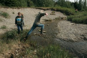 Owen Stickel jumps a creek across from Pyramid Island during Tuesday’s Haines Public Library Trail Adventure (Will Steinfeld/Chilkat Valley News)
