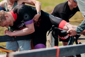 KCIBR individual champion Hudson Lucier is helped off his bike after finishing the race, Saturday, June 21, 2025. (Will Steinfeld/Chilkat Valley News)