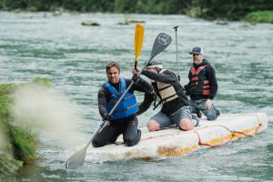 the winning team of Luke Williams, Kevin Shove, and Robert Jennings nears the finish at Saturday’s Mad Raft Race, July 4, 2025. (Will Steinfeld/Chilkat Valley News)