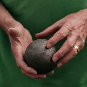 Jim Green holds a shot put lent to him by Nancy Nash, July 25, 2025. (Will Steinfeld/Chilkat Valley News)