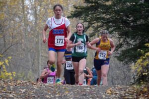 Sophia Hedden climbs up a hill during the 2025 ASAA Cross Country Division III Championships at Mike Janecek Trails in Palmer, Alaska, on Saturday, Oct. 4, 2025. (Jake Dye)