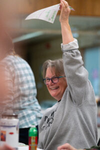 Bingo regular Nelle Jurgeleit-Green celebrates winning a bingo game, Friday, November 14, 2025. (Will Steinfeld/Chilkat Valley News)