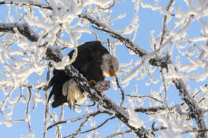 (Rashah McChesney/Chilkat Valley News) An eagle snacks on a fish head in the Chilkat Bald Eagle Preserve on Friday, Dec. 12, 2025, near Haines, Alaska.