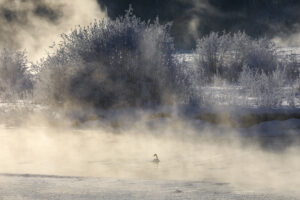 (Rashah McChesney/Chilkat Valley News) A swan paddles in the Chilkat River on Friday, Dec. 12, 2025, near Haines, Alaska.