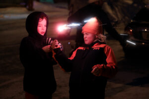 (Rashah McChesney/Chilkat Valley News) Oryn Stanford, 9, and Zephyr Cox, light sparklers during the Haines Holidazzle parade on Saturday, Dec. 13, 2025, in Haines, Alaska.