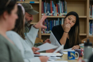 (Rashah McChesney/Chilkat Valley News) Haines’ newest school board member Corrie Stickler listens to board president Shelly Sloper during the meeting on Tuesday, Dec. 2, 2025, in Haines, Alaska. Stickler was selected by current school board members among a pool of five people who applied for an open board seat. She will serve out the remainder of the seat’s term, which is about a year.