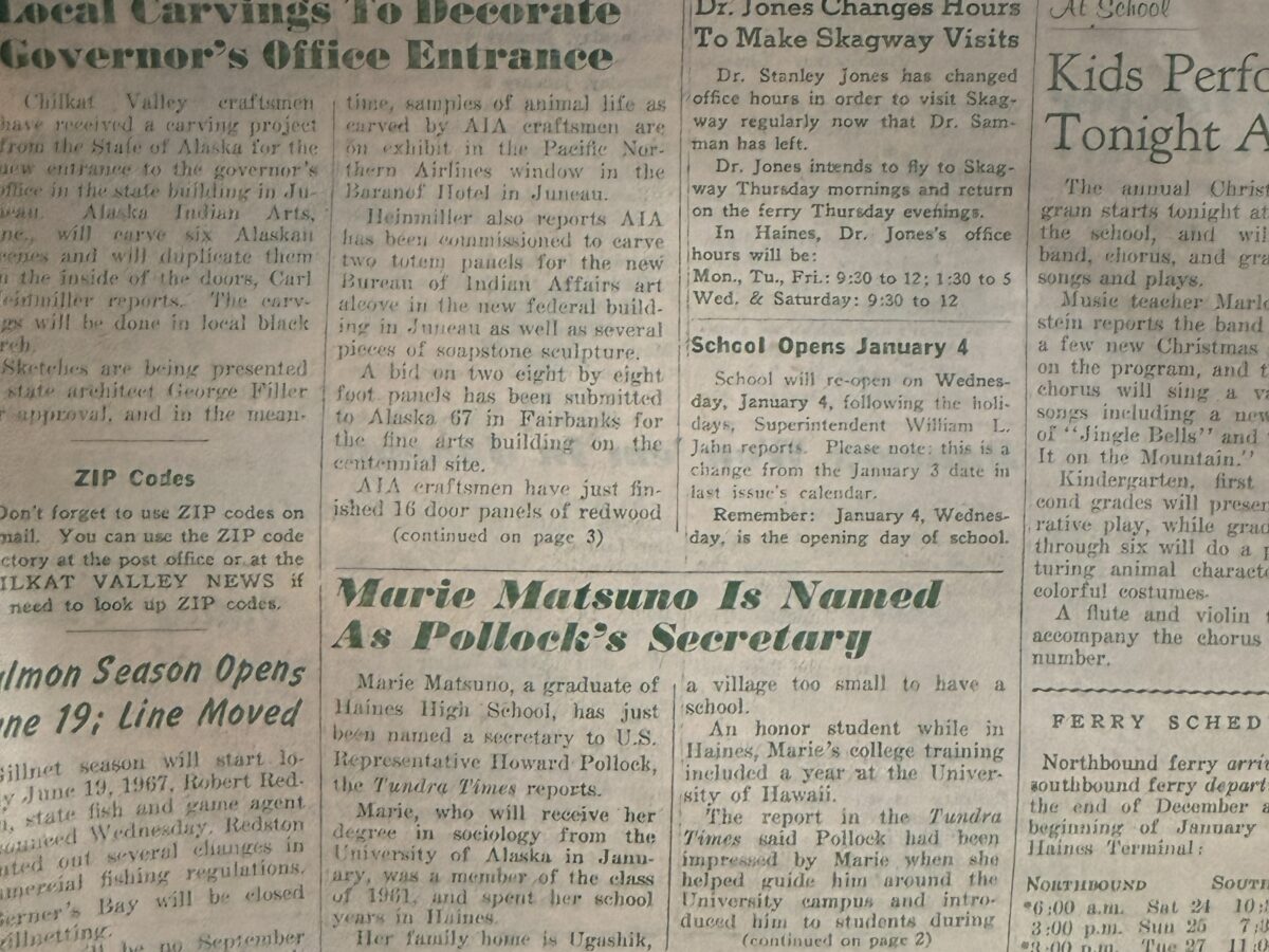 Chilkat Valley craftsmen have received a carving project from the State of Alaska for the new entrance to the governor’s office in the state building in Juneau. Alaska Indian Arts, Inc., will carve six Alaskan scenes and will duplicate them on the inside of the doors, Carl Heinmiller reports. The carvings will be done in […]